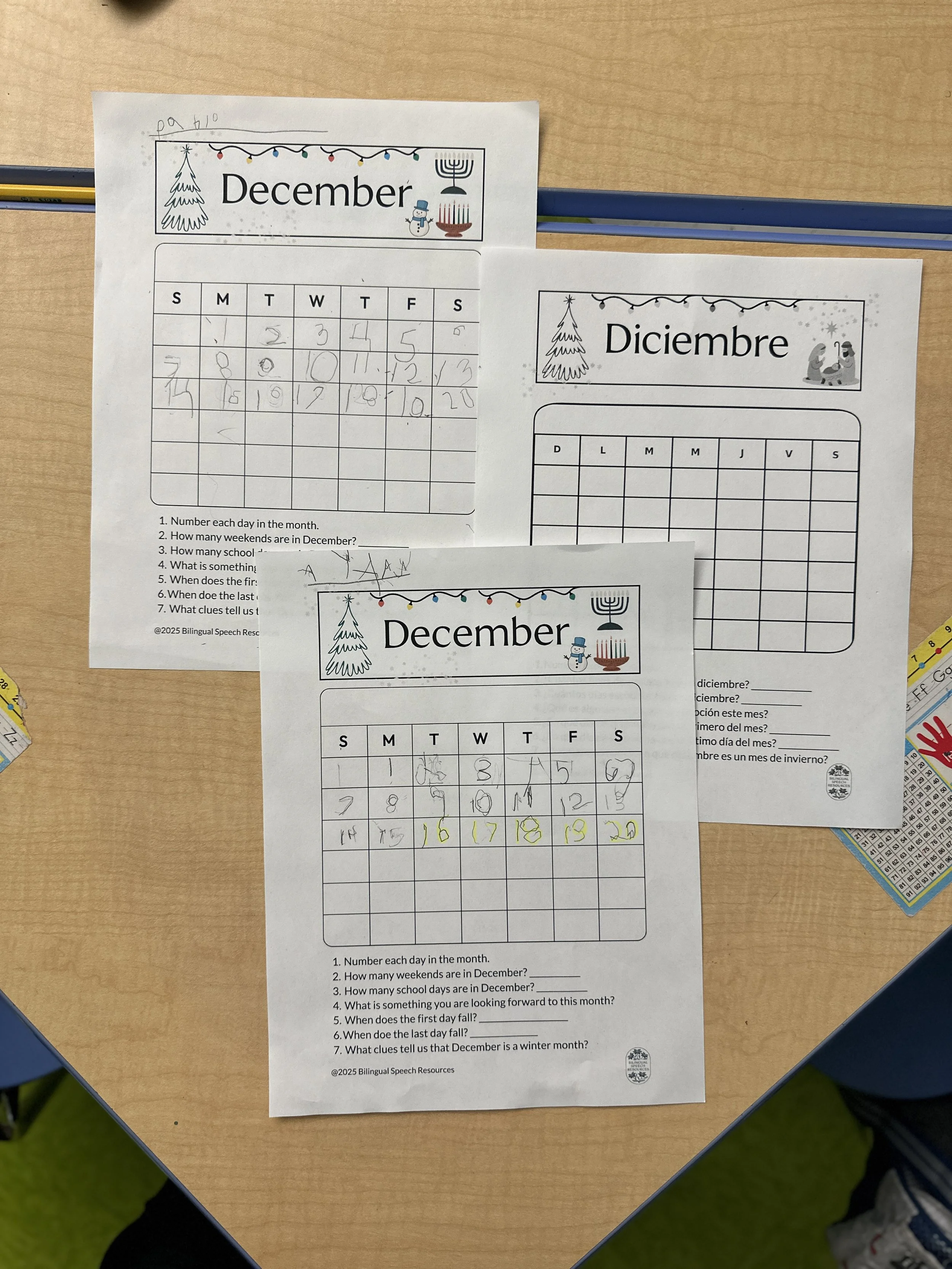 Have students compare December to other months, or compare their English and Spanish calendars to discuss language differences and cultural celebrations.